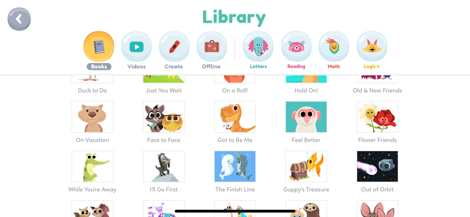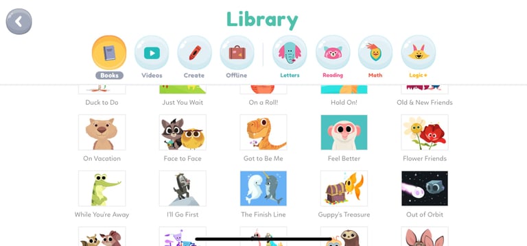 Click the 'Library' in the top left, you'll see children's activities in 8 categories. They are 'Books,' 'Videos,' 'Create,' 'Offline,' 'Letters,' 'Reading,' 'Math,' and 'Logic+.'